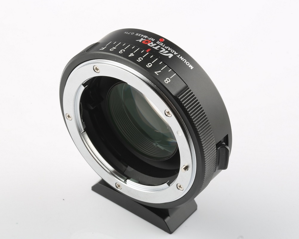 Questo adattatore speedbooster NF-M43X di Viltrox consente di montare un obiettivo Nikon F & G su una fotocamera Micro 4/3